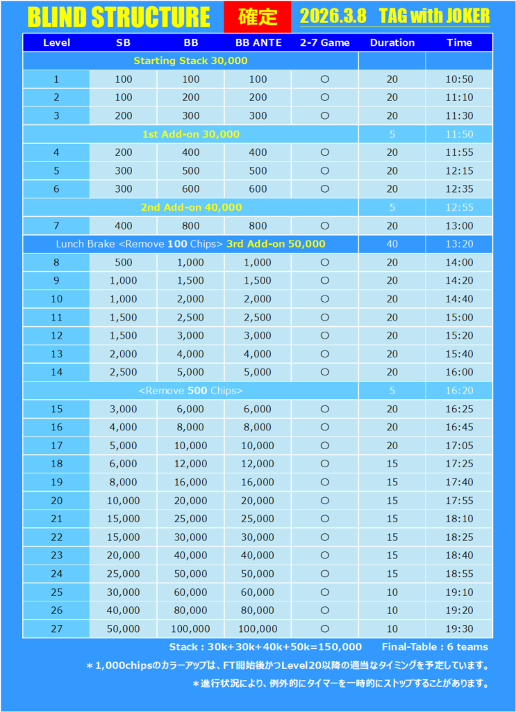 ※ディーラーができる方はご協力をお願いします。尚、タッグチーム内にディーラーがいるいないに関わらず1チーム2名です。